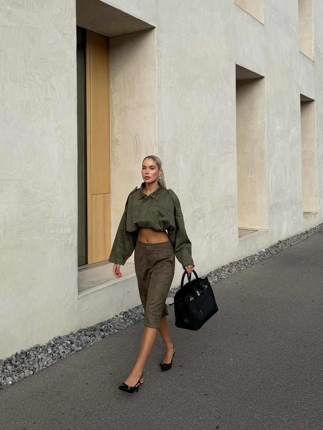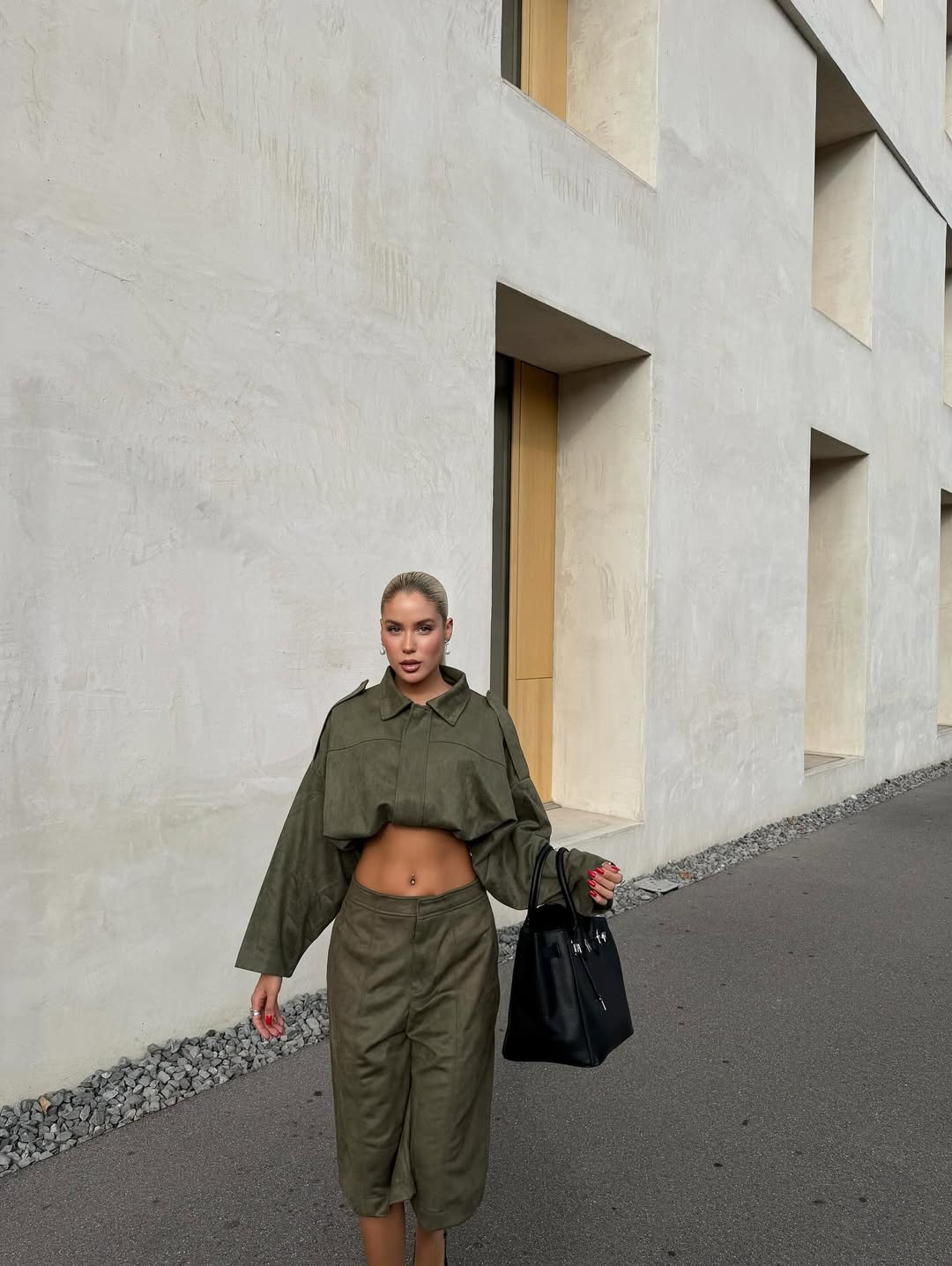 Dieses stylische Zweiteiler-Set in Olivgrün besteht aus einer locker geschnittenen Oversize-Bluse und dazu passenden High-Waist Shorts. Der moderne, minimalistische Schnitt sorgt für einen mühelosen Look, der sowohl lässig als auch elegant kombiniert werden kann. Ideal für den Sommer oder für trendige Layering-Outfits im Frühling und Herbst. Trage es zusammen für einen kompletten Look oder style die Teile einzeln für noch mehr Outfit-Möglichkeiten.